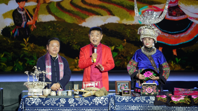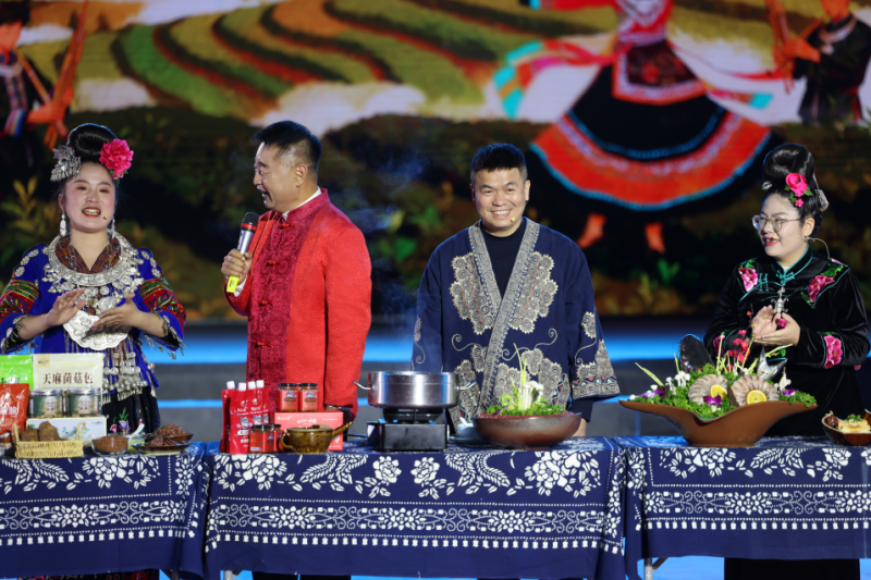 带领观众“云品鉴”雷山特色。在《苗族敬酒歌》与“高山流水”的隆重礼节中,长桌宴上展示了鱼酱酸、乌杆天麻、雷山银球茶等特色物产,将“绿水青山”孕育的“山珍好物”直观呈现。