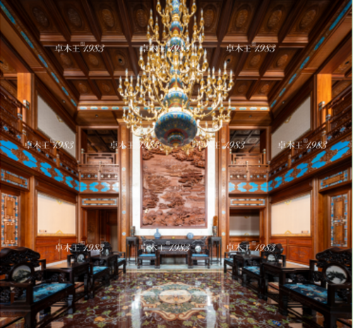 由卓木王红木整装落地的东阳3000㎡宫廷风红木整装传承祖宅的中堂,以故宫乐寿堂为蓝本,融合景泰蓝、玉石、刺绣、大理奢石等珍稀材质,以及东阳木雕、掐丝珐琅等非遗工艺,展现出皇家气派与世家风范。
